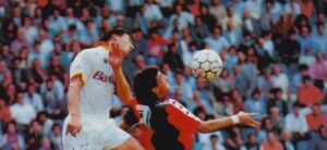 Alla fine degli anni ’80 gli Uhlsport erano tra i palloni più utilizzati in serie A. Inconfondibili i pannelli col tipico taglio in tre forme diverse. Non ho mai fatto una ricerca per stabilire quale fu la prima squadra a usarlo con i colori e lo stemma societario, ma credo che sarebbe un’impresa titanica…